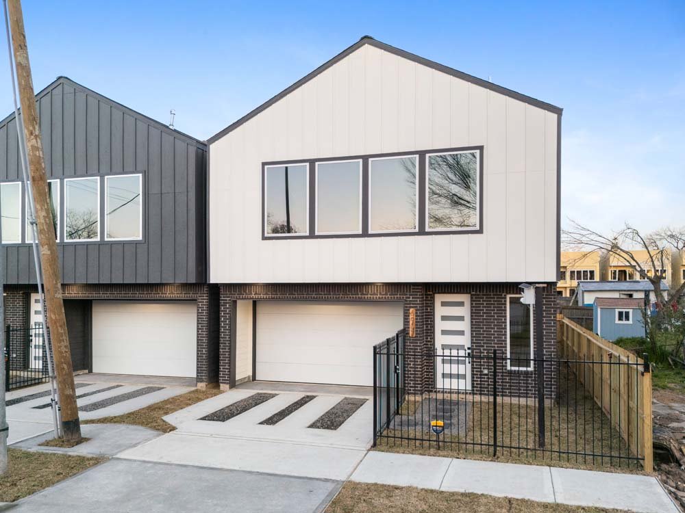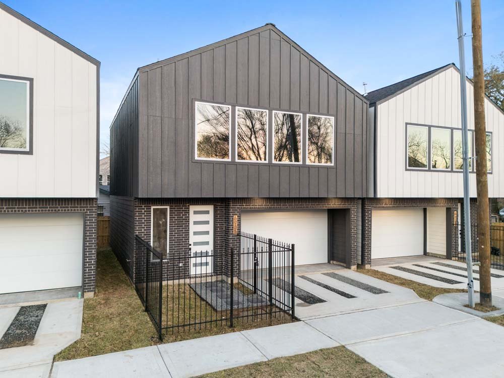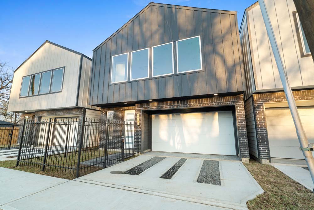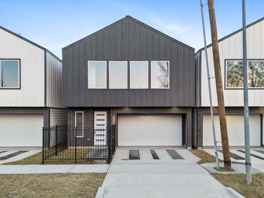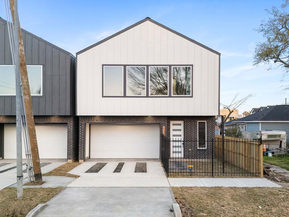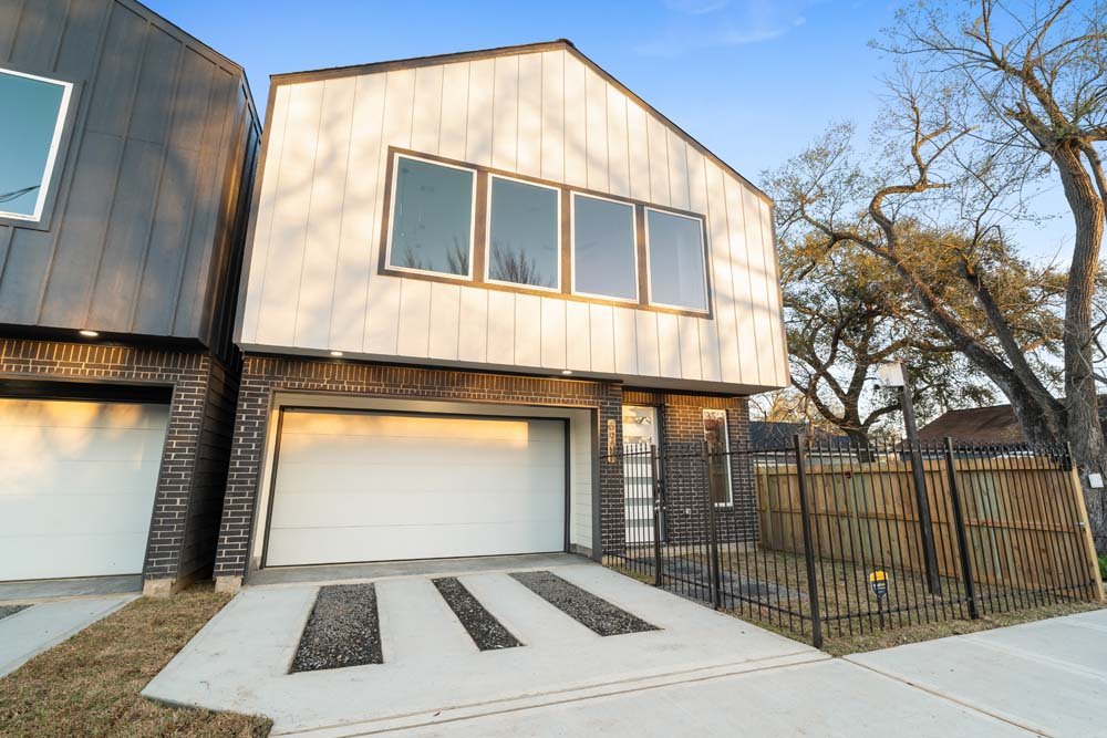 Introducing two sleek modern farmhouse homes by TDG, designed with a timeless, boutique-inspired aesthetic. Conveniently located minutes away from Medical Center, Hermann Park, and the University of Houston and Downtown. Private ribbon driveways compliment the striking Hardie and brick exterior and a thoughtfully landscaped front gated yard. As you enter, a stylish entryway leading to two well-appointed bedrooms. Upstairs, the home unfolds into a light-filled living area framed by four oversized picture windows. The L-shaped kitchen boasts sleek countertops, a fluted waterfall island, and seamless flow into the dining space, creating a refined yet functional layout. The primary has 22-ft cathedral ceilings with exposed beam. Primary ensuite showcases dual sinks, 24×24 designer tile, and an oversized walk-in shower wrapped in floor-to-ceiling boutique tile as well as a spacious walk in closet. LVP flooring runs throughout, offering low maintenance and durability. Welcome Home!