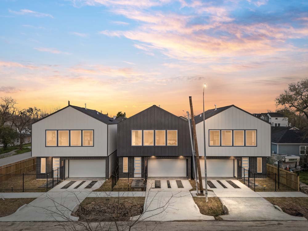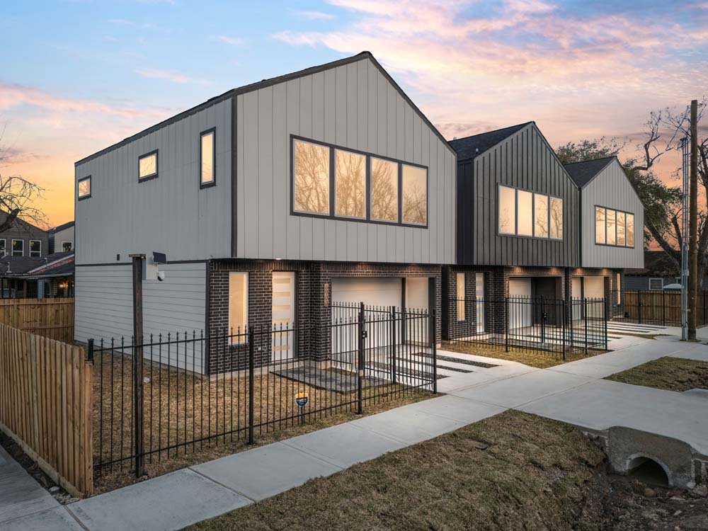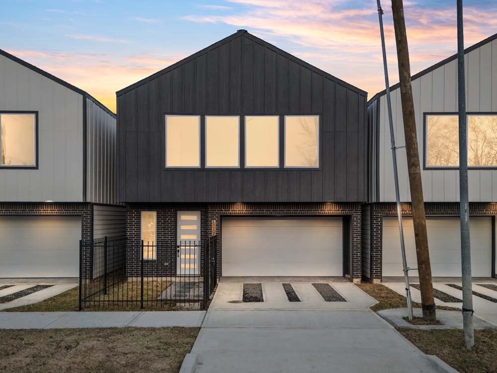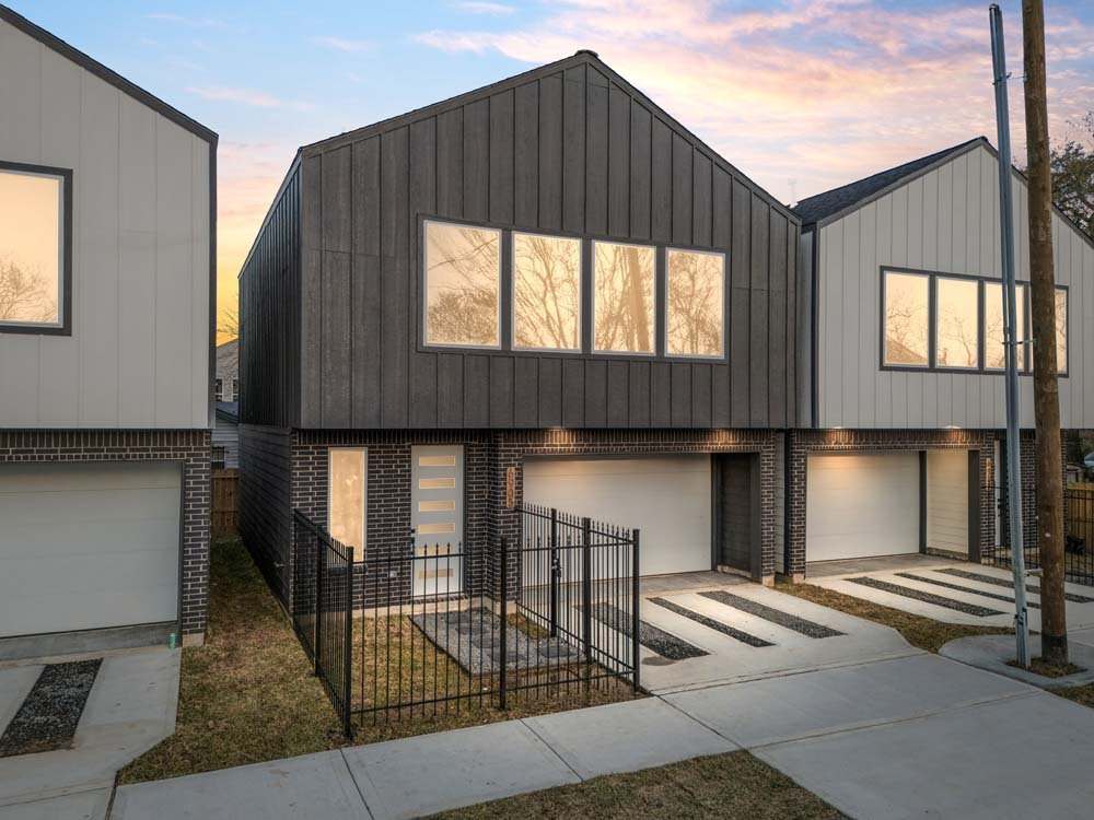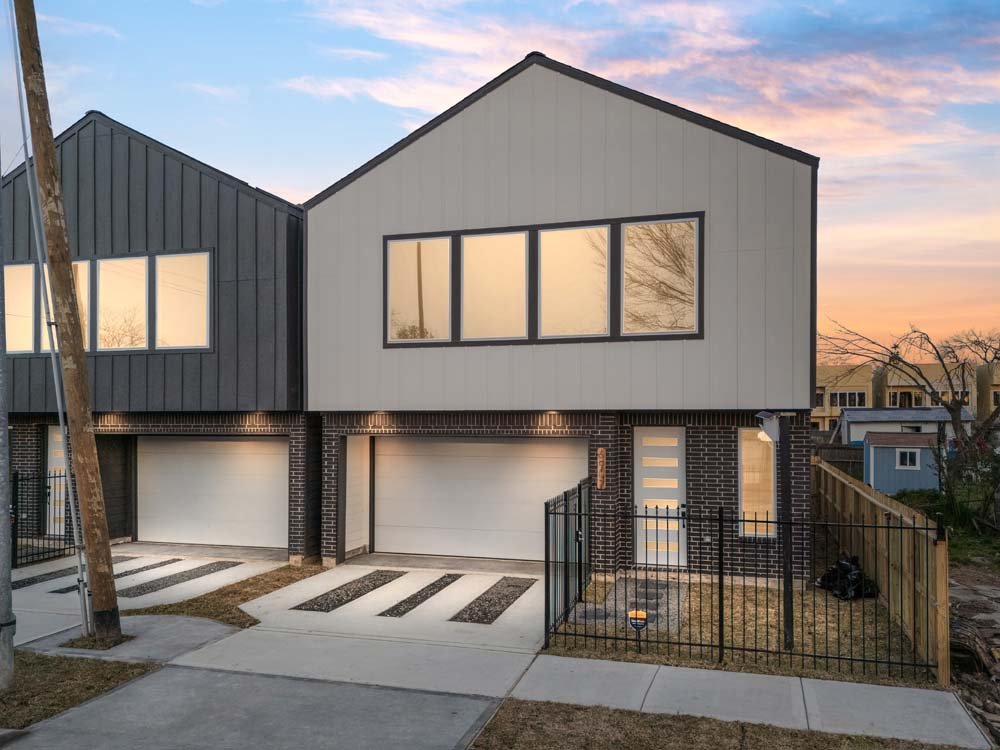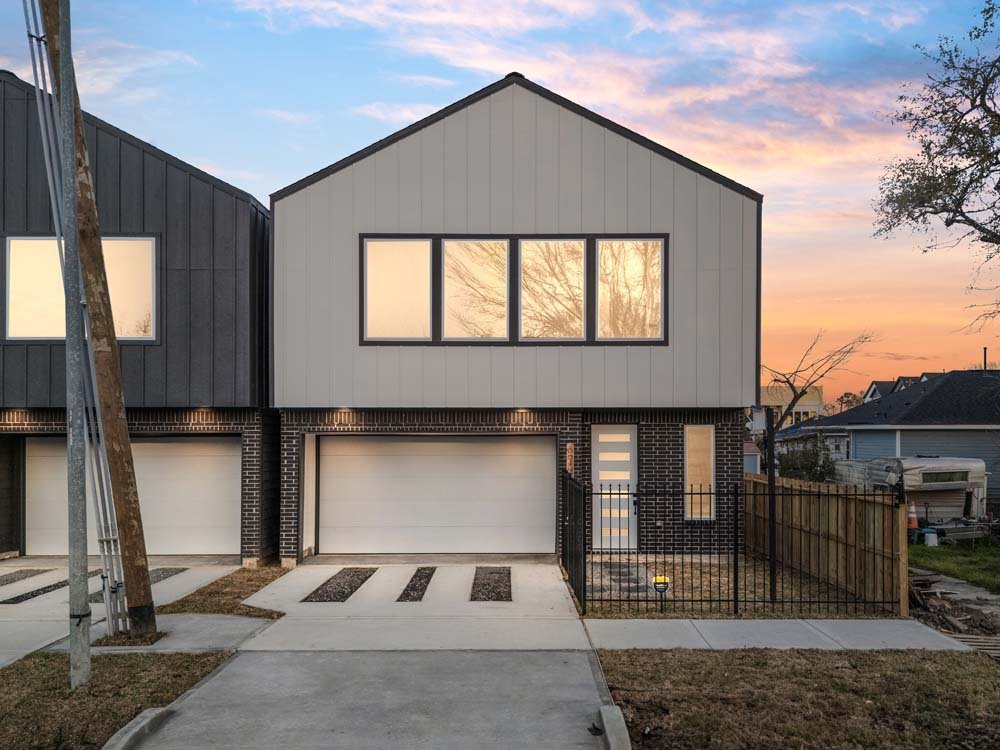 Introducing two sleek modern farmhouse homes by TDG, designed with a timeless, boutique-inspired aesthetic. Conveniently located minutes away from Medical Center, Hermann Park, and the University of Houston and Downtown. Private ribbon driveways compliment the striking Hardie and brick exterior and a thoughtfully landscaped front gated yard. As you enter, a stylish entryway leading to two well-appointed bedrooms. Upstairs, the home unfolds into a light-filled living area framed by four oversized picture windows. The L-shaped kitchen boasts sleek countertops, a fluted waterfall island, and seamless flow into the dining space, creating a refined yet functional layout. The primary has 22-ft cathedral ceilings with exposed beam. Primary ensuite showcases dual sinks, 24×24 designer tile, and an oversized walk-in shower wrapped in floor-to-ceiling boutique tile as well as a spacious walk in closet. LVP flooring runs throughout, offering low maintenance and durability. Welcome Home!