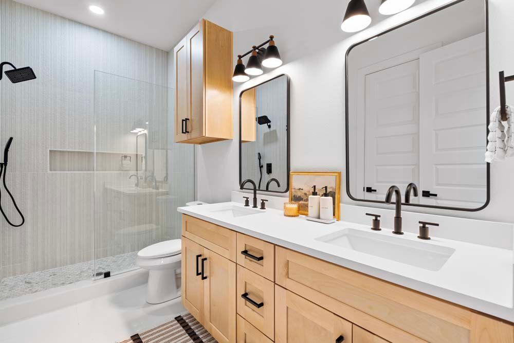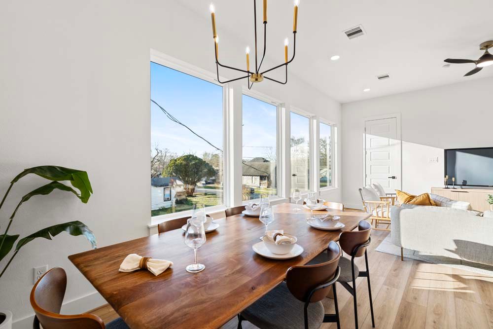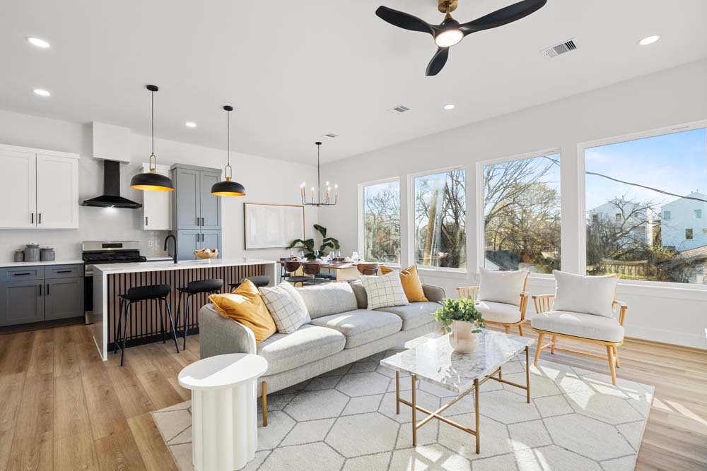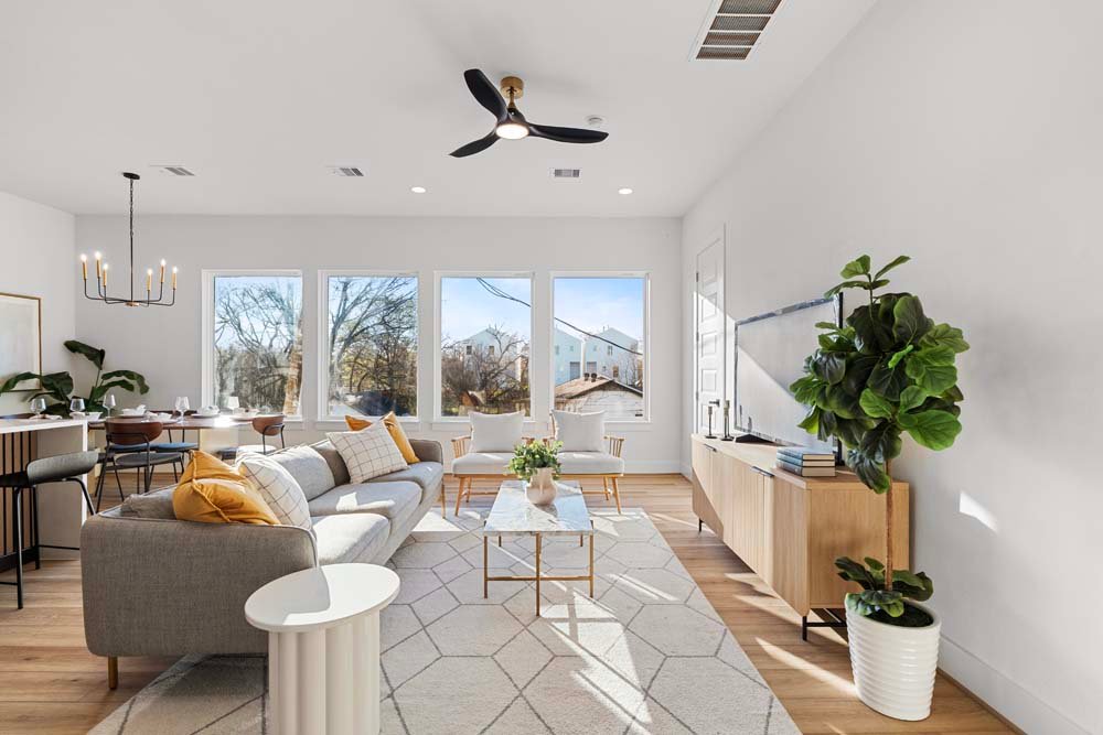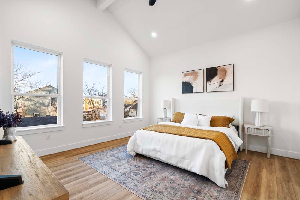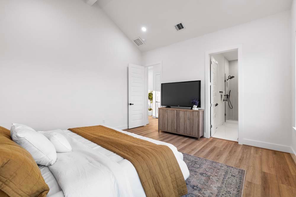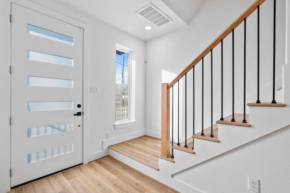 Introducing two sleek modern farmhouse homes by TDG, designed with a timeless, boutique-inspired aesthetic. Conveniently located minutes away from Medical Center, Hermann Park, and the University of Houston and Downtown. Private ribbon driveways compliment the striking Hardie and brick exterior and a thoughtfully landscaped front gated yard. As you enter, a stylish entryway leading to two well-appointed bedrooms. Upstairs, the home unfolds into a light-filled living area framed by four oversized picture windows. The L-shaped kitchen boasts sleek countertops, a fluted waterfall island, and seamless flow into the dining space, creating a refined yet functional layout. The primary has 22-ft cathedral ceilings with exposed beam. Primary ensuite showcases dual sinks, 24×24 designer tile, and an oversized walk-in shower wrapped in floor-to-ceiling boutique tile as well as a spacious walk in closet. LVP flooring runs throughout, offering low maintenance and durability. Welcome Home!
